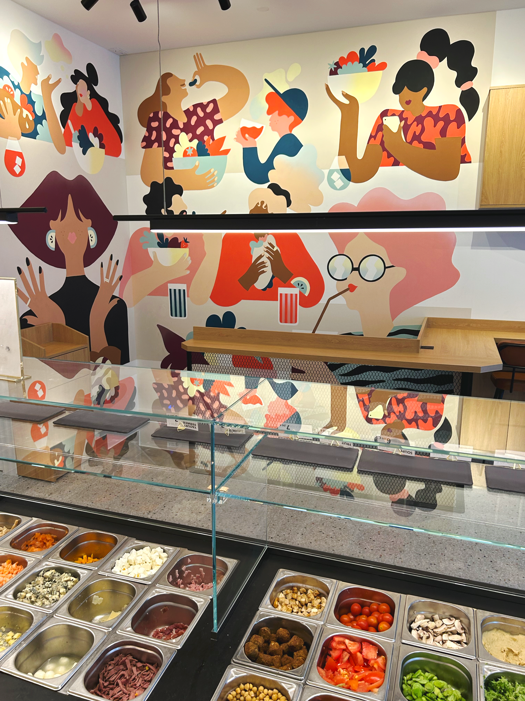 Depuis deux ans, la chaîne de bars à salade Compose habille progressivement ses différents lieux de personnages gourmands que j'ai le plaisir de peindre sur les murs de ces beaux espaces lumineux.