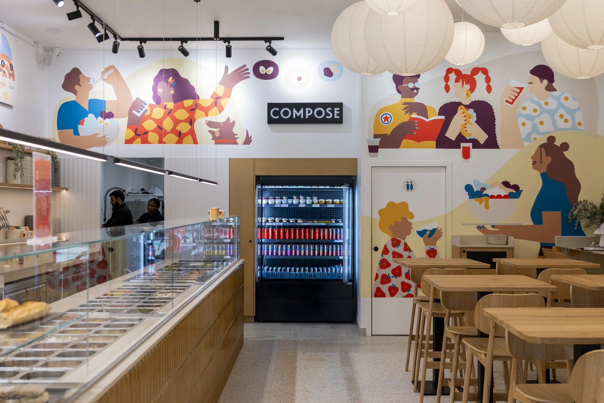 Depuis 2023, la chaîne de bars à salade Compose habille progressivement ses différents restaurants de personnages gourmands que j'ai le plaisir de peindre sur les murs de ces beaux espaces lumineux.