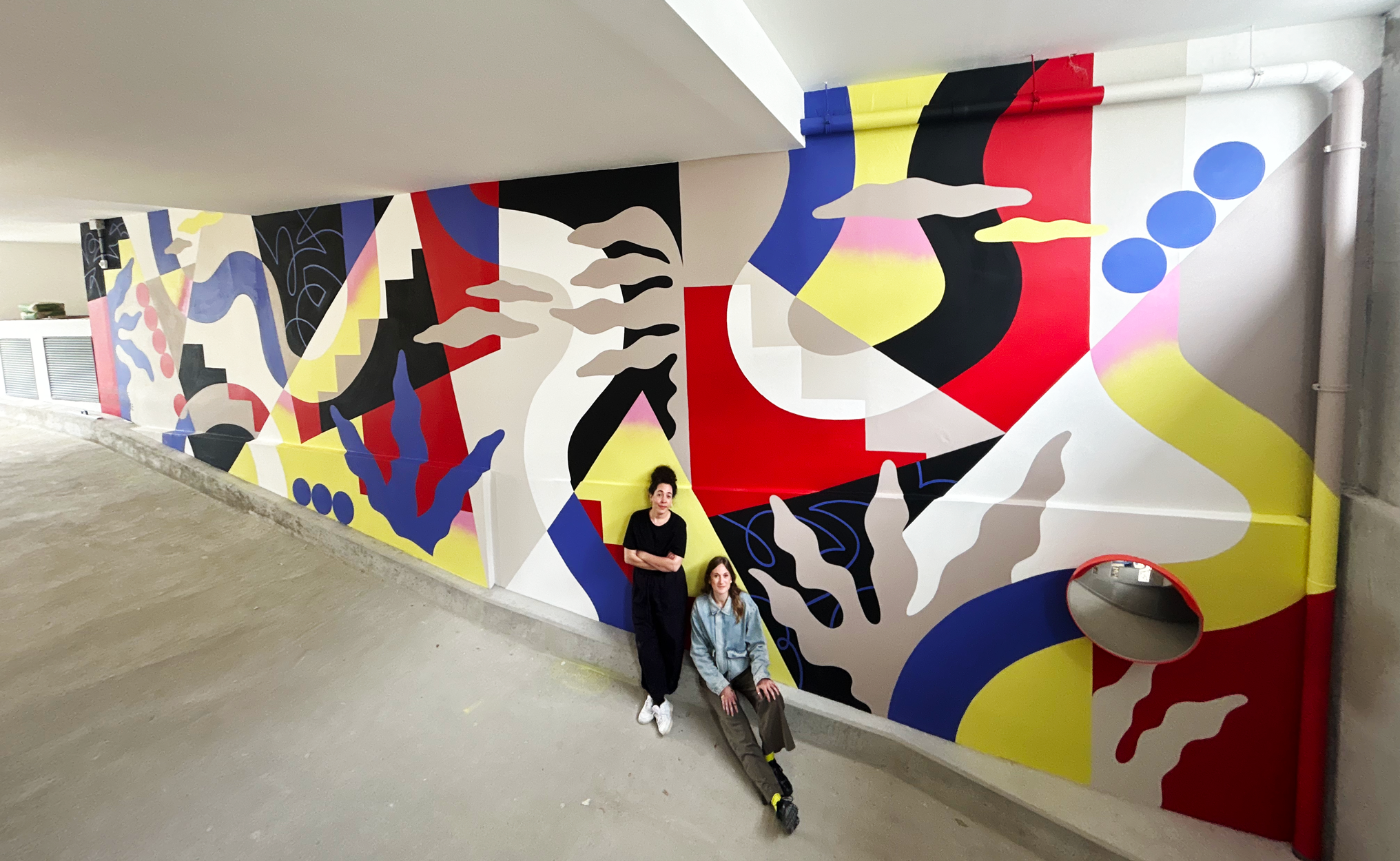 La façade extérieure du bâtiment été pensée comme un hommage à Mondrian, en reprenant ses jeux de lignes et les couleurs primaires. Pour y faire écho, nous avons proposé une représentation personnelle, abstraite et contemporaine du jardin de la résidence, en lien avec l’adn du bâtiment.