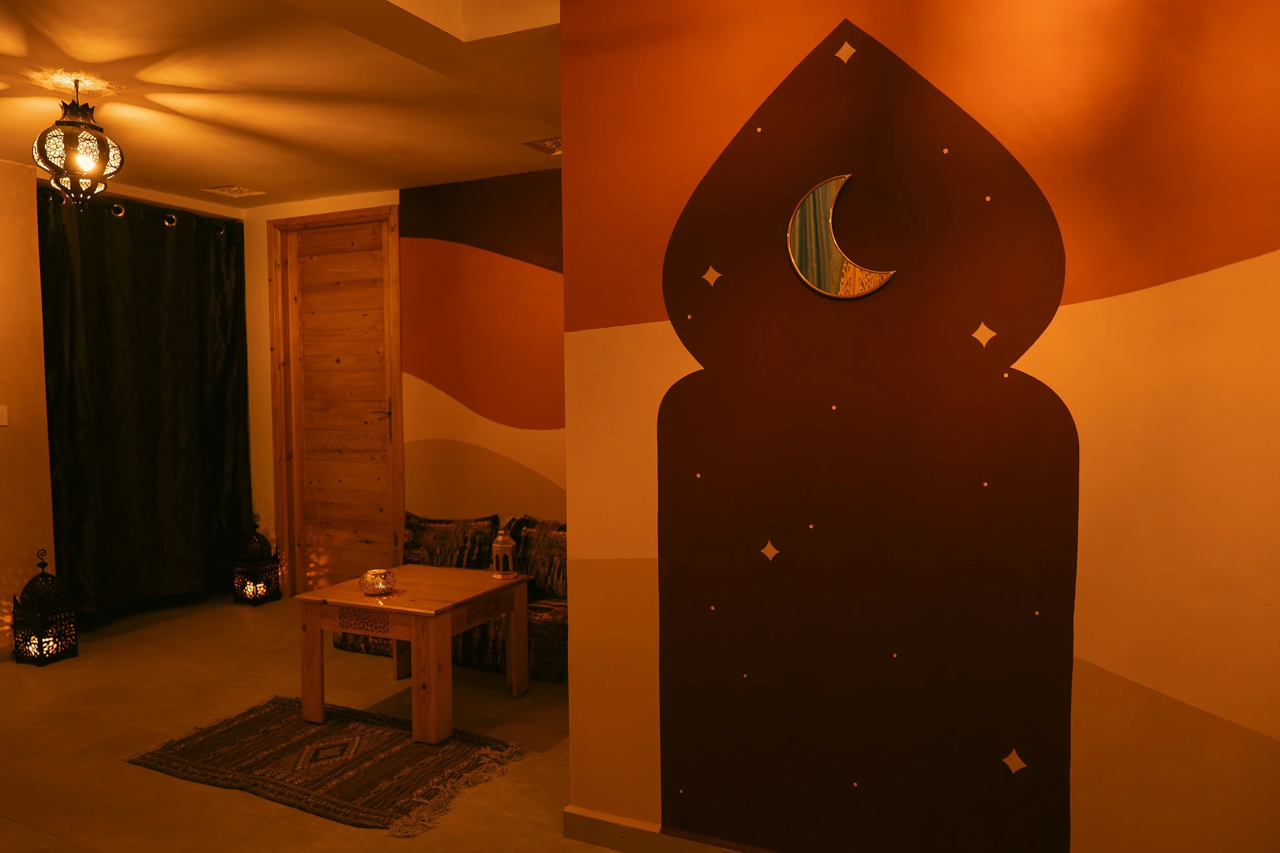 J’ai peint les espaces communs ( la cuisine, la piscine et le hammam) avec l’envie de créer des lieux accueillants et chaleureux, à l’image de ses hôtes.